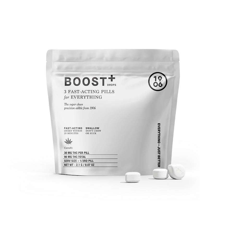 Can we go even higher? Yup. Introducing 30mg Boost+ Drops. A dose of fast-acting (like 20 minutes fast) THC to use alone, with other 1906 experiences, or other consumption methods. Vegan, zero sugars, zero calories, and gluten-free. Available in 90mg resealable pouches. Swallow, don’t chew! Each Boost+ Drop contains 30mg THC.