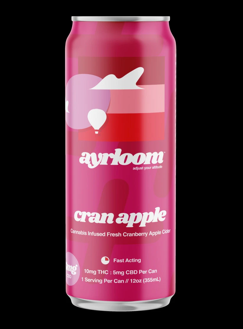 Ayrloom’s Cran Apple Cider is a 12oz, sparkling, cannabis-infused beverage containing 10mg THC and 5mg CBD. Produced by the century-old Beak & Skiff orchard in New York, it features a 2:1 THC-to-CBD ratio, offering a tart and sweet flavor profile designed for a balanced, uplifting, and relaxing experience