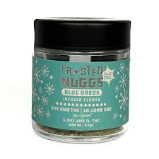Blue Oreo Frosted Nuggs from Kiefers are buds evenly covered with distillate and coated in kief. Blue Oreo is hybid with a happy, relaxed and giggly high. The flavor profile is fresh fruit, berries, citrus, hopps & pine. Break it up and roll or pack in a bowl!