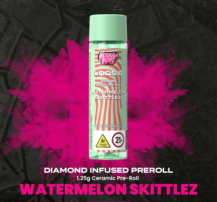 Dive into a burst of refreshing sweetness with Watermelon Z Loosies — the ultimate treat for your taste buds. Each Loosie is meticulously crafted with 1.25 grams of premium flower, infused with diamonds, and coated with Bodega Boyz THCA diamonds, ensuring a next level experience with every inhale. Experience the juicy essence of ripe watermelon, perfectly complemented by the playful fusion of fruity Zkittlez flavors. With its tantalizing terpene profile, Watermelon Z Loosies transport you to a summer paradise with every puff. Reusable ceramic tips make this experience hit different.