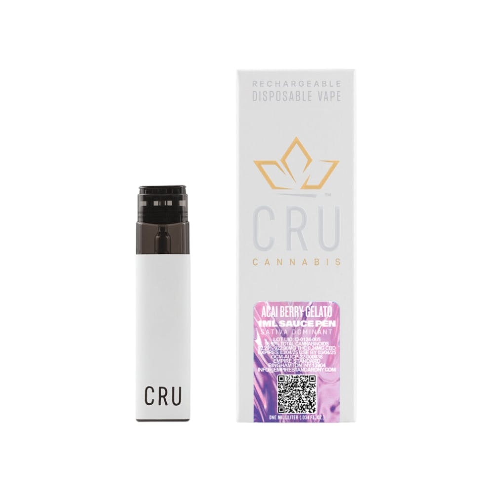"CRU Acai Berry Gelato 1G AIO features 1 gram of premium cannabis oil derived from the Acai Berry Gelato hybrid strain. This formulation offers a rich terpene profile with sweet berry and creamy vanilla notes, dominated by Caryophyllene, Limonene, and Myrcene. Known for its balanced effects, Acai Berry Gelato provides uplifting cerebral clarity combined with smooth body relaxation. The draw-activated all-in-one vaporizer employs ceramic coil technology for consistent heating, smooth vapor production, and full terpene preservation from first draw to last."