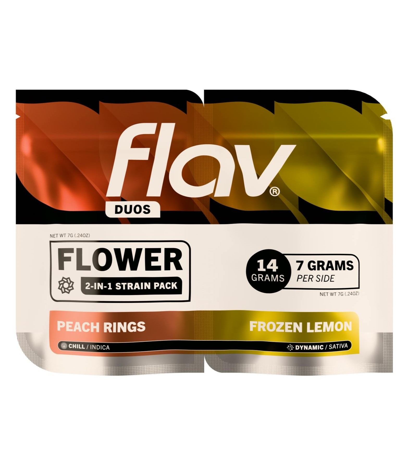 Experience a dynamic pairing of premium cannabis with Flav Duos, a 14g selection of two distinct strains designed with complimentary effects and terpene profiles to elevate your senses. Featuring two standout strains Peach Fuzz(Indica), a deeply relaxing indica strain known for its sweet fruity flavor and soothing effects, and Frozen Lemon (Sativa) a vibrant sativa strain packed with zesty citrus notes and an energizing high
