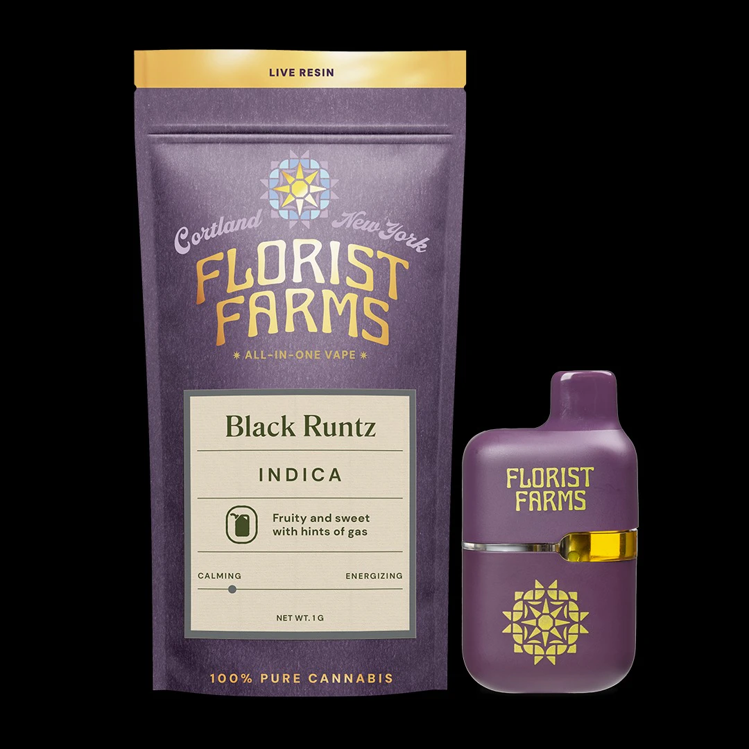 "Florist Farms Black Runtz 1G Live Resin AIO contains 1 gram of premium live resin cannabis oil derived from the Black Runtz hybrid strain. This formulation preserves a full-spectrum terpene profile rich in Limonene, Caryophyllene, and Myrcene, delivering sweet, fruity, and earthy notes with enhanced flavor and aroma. Known for its balanced euphoric and relaxing effects, Black Runtz promotes uplifting cerebral stimulation alongside smooth body relaxation. The draw-activated all-in-one vaporizer utilizes ceramic coil technology for consistent heating, smooth vapor production, and optimal terpene retention throughout use."