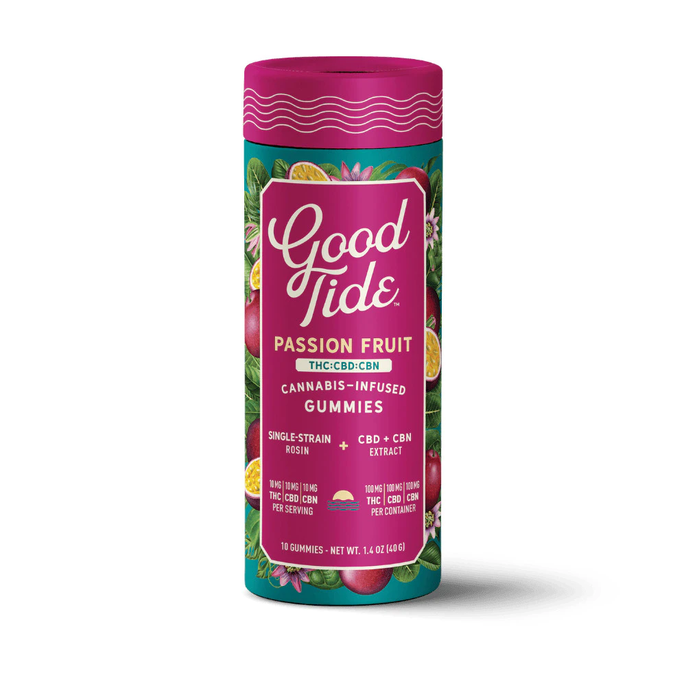SLEEP 1:1:1 THC:CBD:CBN Take your mellow to the next level with Good Tide Passion Fruit THC:CBD:CBN gummies. An Indica single-strain rosin is enhanced with an extra dose of CBN and CBD’s relaxing properties and the tropical delight of passion fruit flavor to help you drift into a world of dreams.​ Sway into the perfect hammock nap.