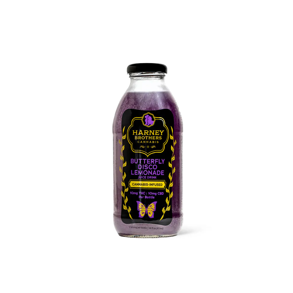 The Harney Brothers Butterfly Disco Lemonade is a cannabis-infused beverage featuring a 1:1 ratio of THC and CBD, designed for relaxation and a balanced feel.