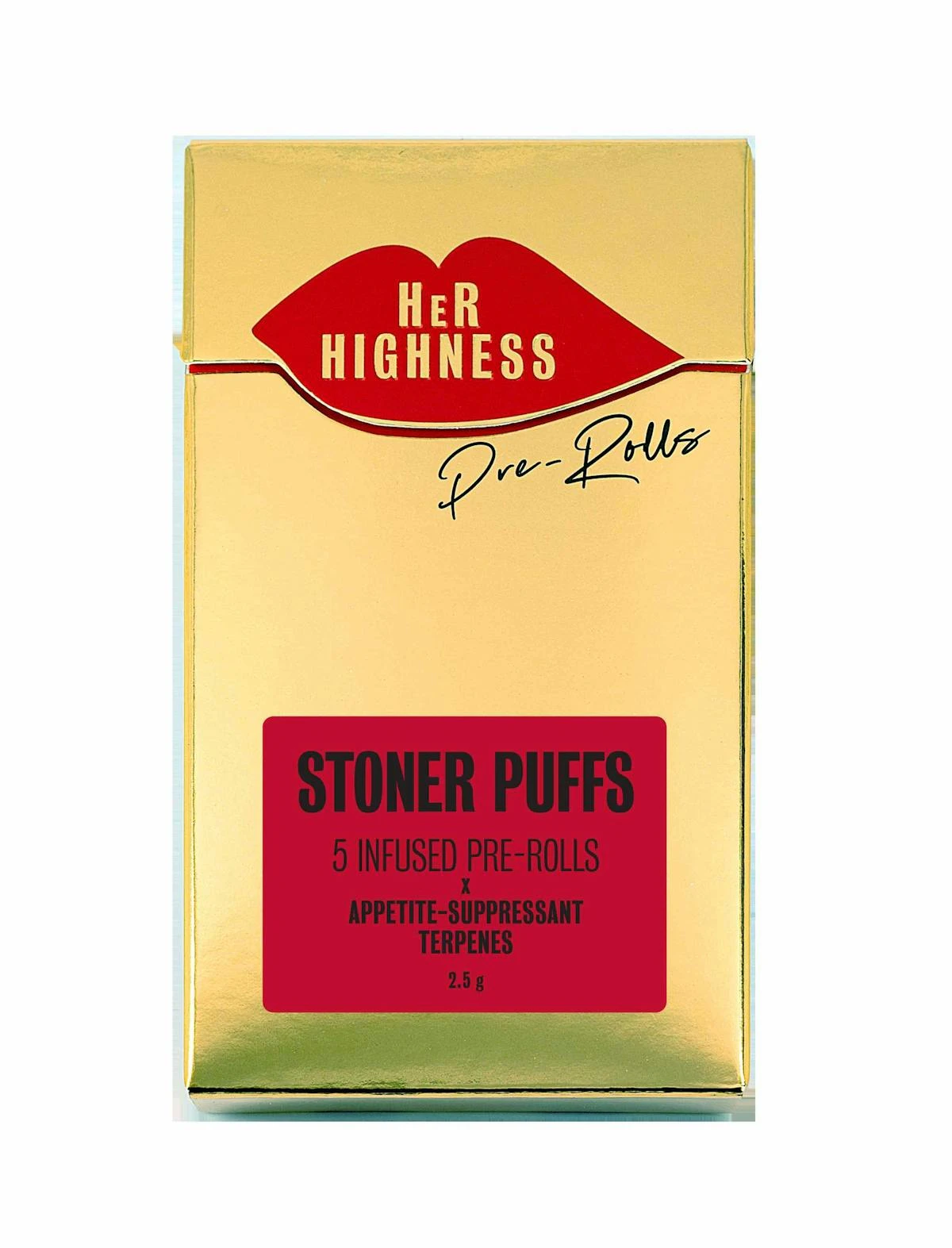 Stoner Puffs provide a euphoric, buzzy, creative high. Designed to be potent, for getting ripped and feeling blissfully stoned. Infused with kief, distillate, and appetite-suppressant terpenes high in THC-V, they're low-munchies. Premium Runtz Ether is a cut of Alien Dawg, a hybrid gifting an immediate cerebral rush of lifted euphoria before turning delightfully stonery. Her Highness ultra feminine pre-rolls are slim, elegant and beautiful to smoke, featuring an extra long crutch to protect nails and lashes. Includes five 0.5g infused prerolls.