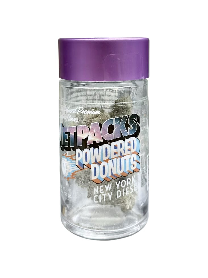 Jetpacks' Powdered Donuts NYC Diesel is a frosted flower experience that turns up the volume on this legendary sativa-dominant hybrid. Coated in potent THCa crystals, each 3.5g jar delivers amplified effects and rich flavor. NYC Diesel’s signature fuel-forward nose is backed by citrus zest and a sour grapefruit bite, with terpenes like limonene and myrcene leading the charge. Expect an energizing, talkative high that uplifts the mood and sharpens the senses—perfect for social sessions or a creative boost. The frosted coating adds serious potency without overwhelming the classic NYC Diesel profile.