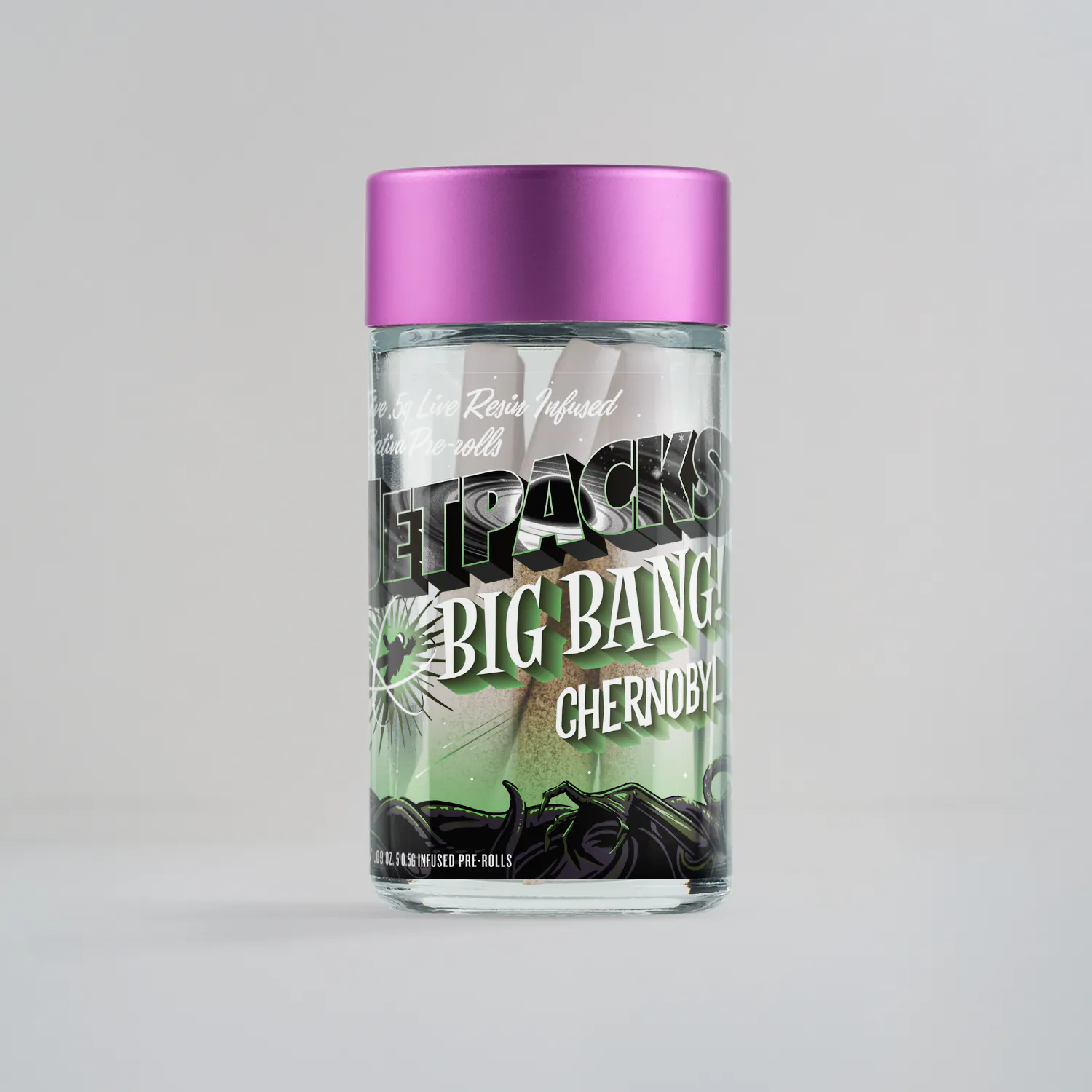 Jetpacks Big Bang Chernobyl 5-pack pre-rolls offer a powerful and flavorful experience for those who appreciate premium cannabis. Each pack includes five 0.5-gram pre-rolls made with high-quality whole flower, then infused with live resin, high THCa extract, and cannabis oil. Diamond-encrusted and rolled in kief, these pre-rolls deliver enhanced potency and a rich, full-bodied flavor.