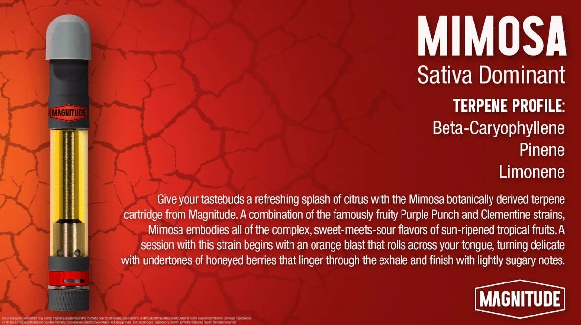 Give your tastebuds a refreshing splash of citrus with the Mimosa botanically derived terpene cartridge from Magnitude. A combination of the famously fruity Purple Punch and Clementine strains, Mimosa embodies all of the complex, sweet-meets-sour flavors of sun-ripened tropical fruits. A session with this strain begins with an orange blast that rolls across your tongue, turning delicate with undertones of honeyed berries that linger through the exhale and finish with lightly sugary notes.