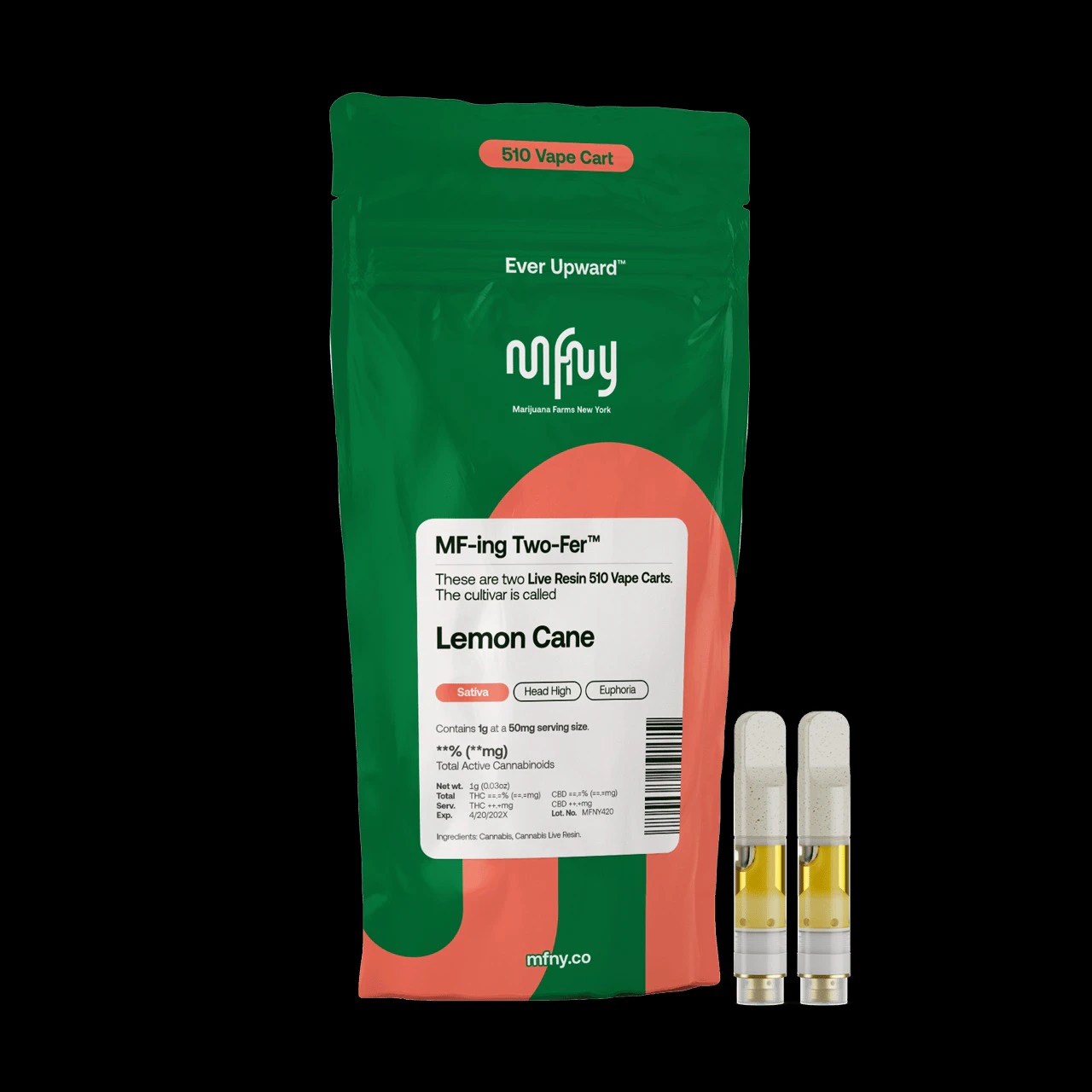 MF-ing Two-Fer: We're now offering two 1/2g carts in one bag. Why? Pouring less oil into each cart means we can preserve more of the plant’s full spectrum cannabinoids, remarkable natural terpenes and fuller flavor. Not only that, the Two-Fer is better value and more of our single-source, in-house produced Lemon Cane real live resin: lemon peel zest flavor that is finished off with a touch of gas; known to promote a euphoric head high with long-lasting, invigorating cerebral effects that spread to the rest of your whole body.