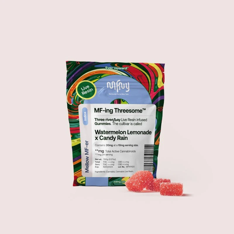 Three is the magic number when it comes to our tasty, terpene-rich gummies. It’s the low-cost, low-commitment way to find your favorite flavor and cultivar combinations. This MF-ing Threesome features our live resin Watermelon Lemonade x Candy Rain gummies. These vegan gummies are infused with MFNY’s single-source, in-house produced Candy Rain live resin. We start with fresh-frozen flower buds, then use the hydrocarbon extraction method (plus years of experience and scientific precision) to deliver the purest plant extract. An extract that showcases the cultivar's naturally-produced, full-spectrum cannabinoids and remarkable natural terpenes. Candy Rain is known for its sweet candy flavor, and we’ve complemented this cultivar, with watermelon lemonade flavors (and the minimum amount of sugar).