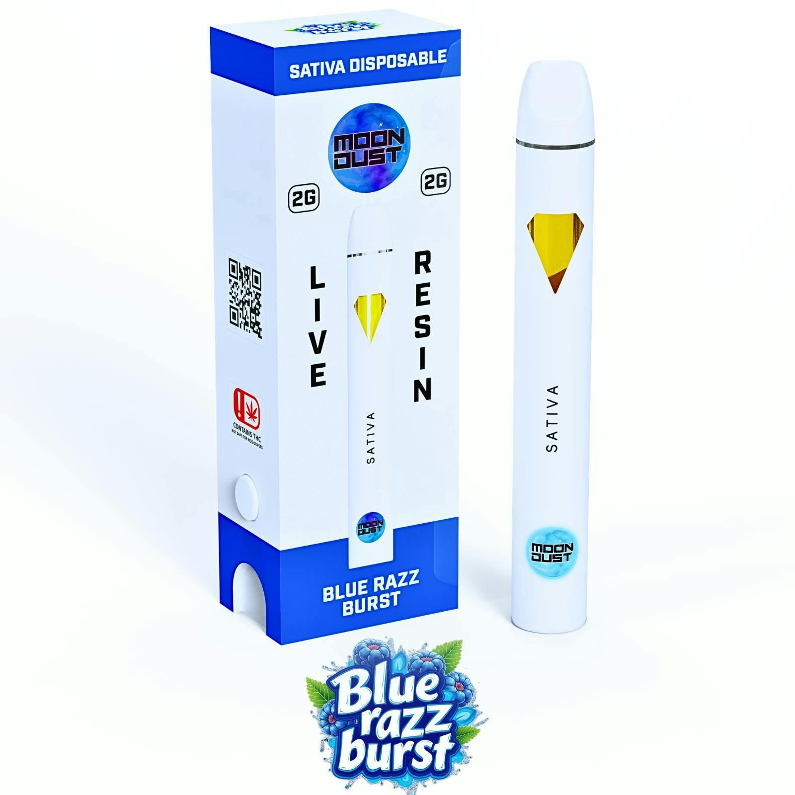 Ignite your senses with Moon Dust’s 2g Blue Razz Burst Sativa Live Resin Disposable—crafted for those who crave bright flavor, clean vapor, and uplifting effects.