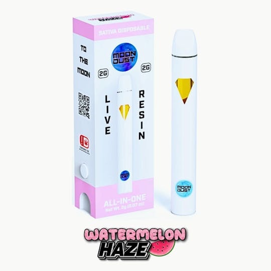Indulge in the ultimate vaping experience with Moon Dust's 2g Watermelon Haze Sativa Live Resin Vape, crafted for connoisseurs who demand purity, potency, and unparalleled flavor.