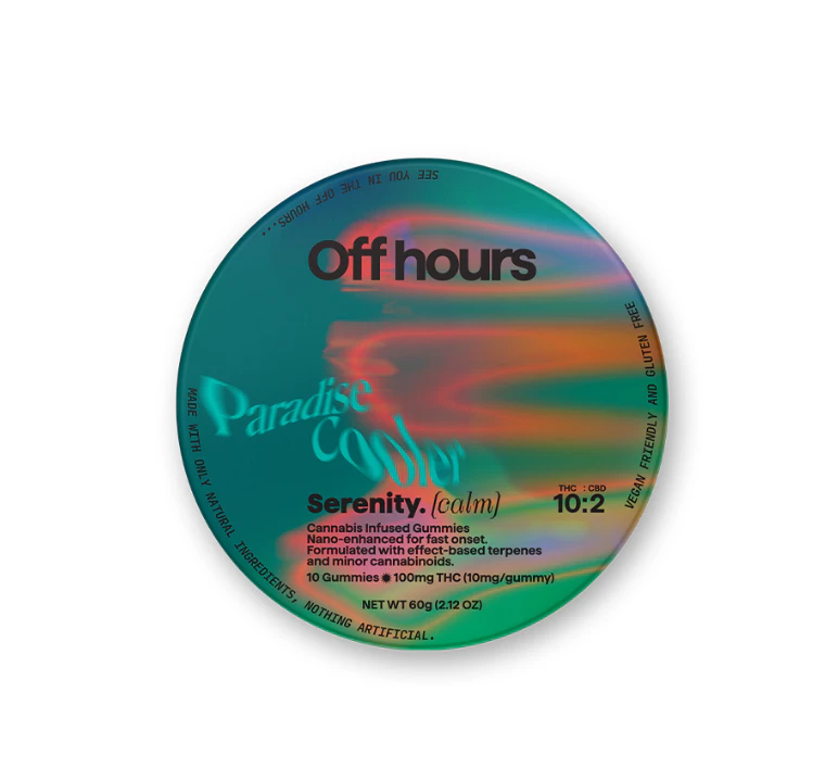 Chill out with Off Hours Paradise Cooler Serenity gummies. Developed with a calming blend of THC, CBD, and CBN, these gummies are the perfect escape.