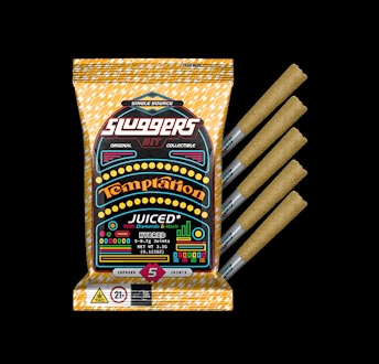 Sluggers JUICED* 5-Pack Blunts come Triple-Infused with Premium Flower, Solventless Hash, Diamonds, High Terpene Extract, and rolled in kief. Each pack comes with 5 hard hitting JUICED blunts and an exclusive collectible card, sealed in an air tight, golden holographic tin and mylar for long lasting freshness and quality.